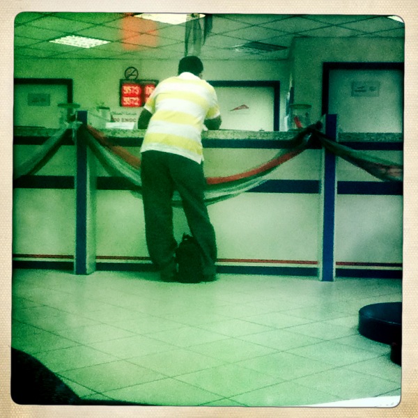 I pass to the adjoining room where I sit on an identically industrial plastic chair and watch a man pass by in wayfarer sunglasses, black skinny jeans, a gray dress shirt , pointy black boots, and a mop of unruly black curly hair that could be confused for a mullet. He greets the counter worker, “As-Salāmu `Alaykum”, the common Arabic greeting. I’ve recently started to adopt the greeting and the previously stoic, cold, and unavailable Emirati nationals have become much more open, much more friendly, and much more available. After three and a half years, I realize how much the ignorant foreigner I have been. The number 571 flashes on the LED hung over counter 11. “As-Salāmu `Alaykum”, I say as I approach the counter, hoping my pronunciation is good enough to be understood.