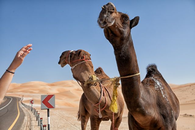 After a few hours of dull flat grayish sand, the desert finally started to show a whole other side of itself. The sand became deep reddish-orange. Free roaming camels were now a regular sighting on top of the flowing dunes. As we moved along the winding highway, the dunes on both sides grew in size and changed in shape and form. We really started to get a sense of this powerful wilderness. The sands from the dunes floated over the road in thin layers as a constant reminder from the desert, of who’s really the boss here and how easy it would be for it to claim it all back.