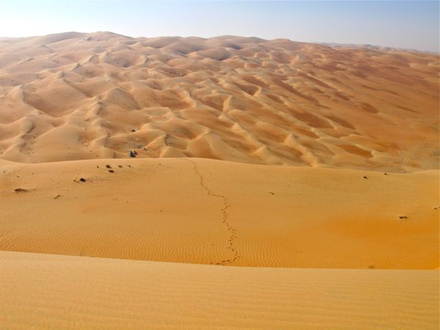 Looking over the horizon, I had never before witnessed such a view. The golden dunes lied unbroken in every direction like waves across the ocean. The Bedouins refer to the Empty Quarter as the sea of deserts and now I know why. High up on the shoulders of this monster dune, the silence was almost disturbing as I literally could not hear a thing; absolutely nothing. I contemplated how powerful, hostile and gorgeous this environment is and how tough the beduins must be to survive here. I wondered how long it will take, if ever, until the word really gets out and this becomes a national park, complete with entry fees and groups of people everywhere. I wished my friends were here to experience this moment with me, but I was equally, albeit guiltily, pleased to have this unique opportunity to myself.