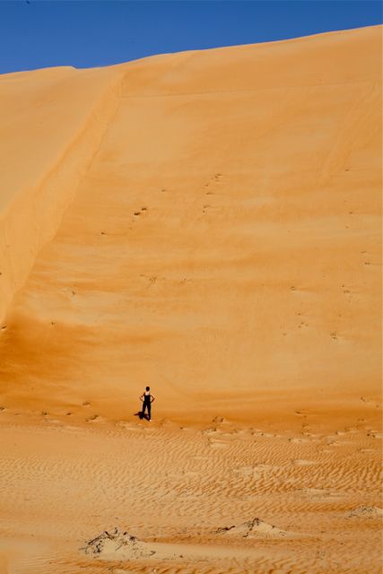Taking long leaps back down to the camp, the sand came alive, making unexpected musical sounds and squeaks, singing out every time I landed and slid along. In a few short minutes I was back to the bottom, leaving behind a long vertical trail, that in few hours would be smoothed over by the desert winds, leaving no trace of my presence.